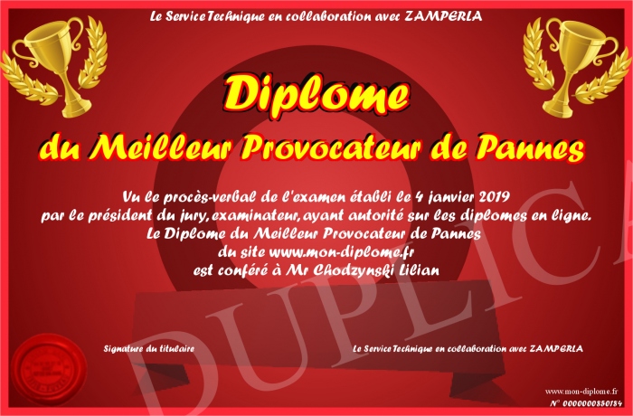 Envoyez par email votre Diplôme du Meilleur Provocateur de Pannes personalisé