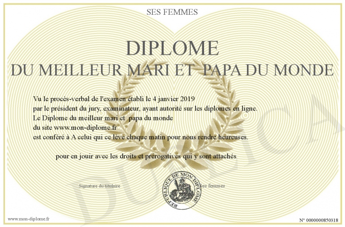 Envoyez par email votre Diplôme du meilleur mari et papa du monde personalisé