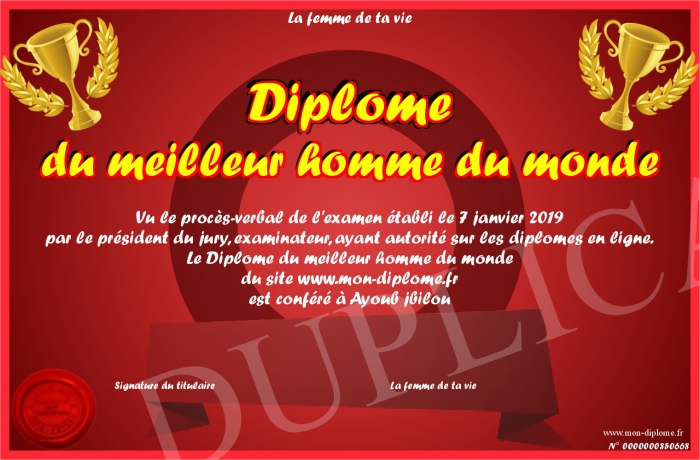Envoyez par email votre Diplôme du meilleur homme du monde personalisé