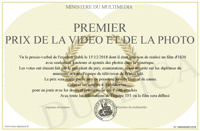 Envoyez par email votre Premier prix de la vidéo et de la photo personalisé