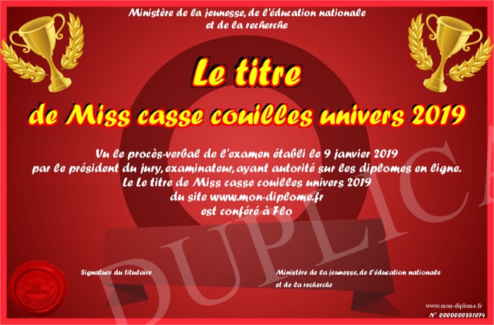 Envoyez par email votre Le titre de Miss casse couilles univers 2019 personalisé