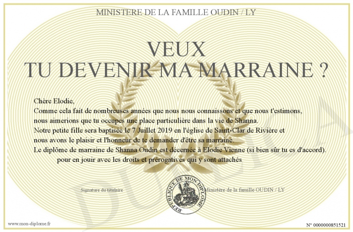 Envoyez par email votre Veux tu devenir ma marraine ? personalisé