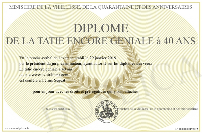 Envoyez par email votre Diplôme de la tatie encore géniale à 40 ans personalisé