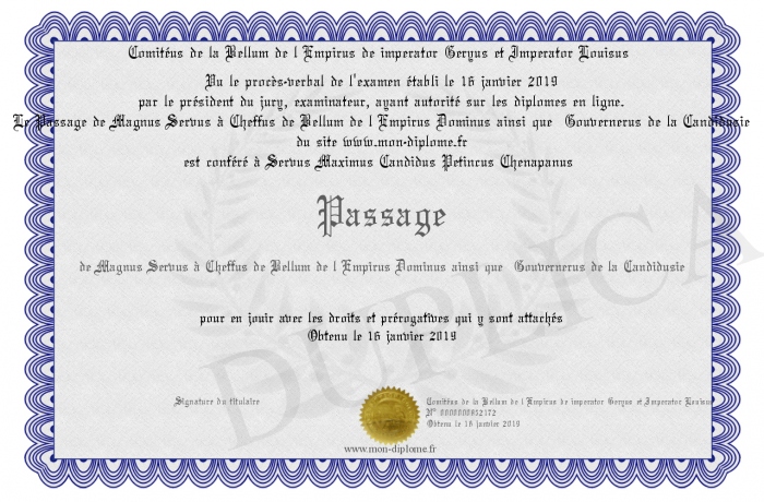 Envoyez par email votre Passage de Magnus Servus à Cheffus de Bellum de l Empirus Dominus ainsi que Gouvernerus de la Candidusie personalisé