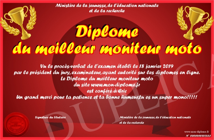 Envoyez par email votre Diplôme du meilleur moniteur moto personalisé