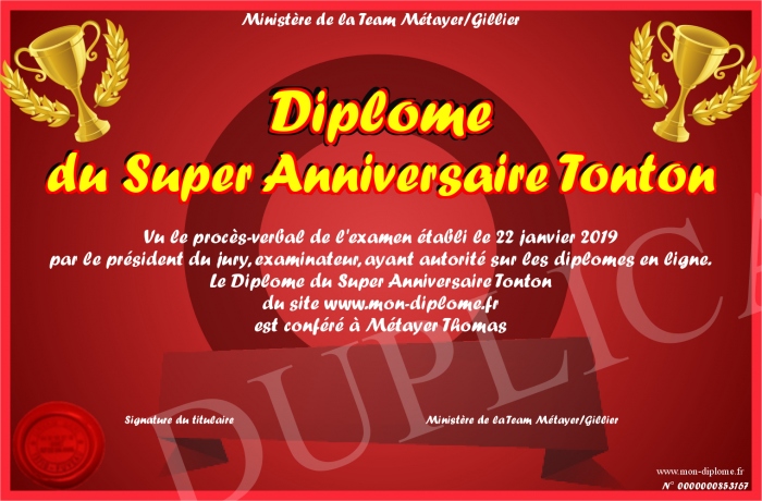 Envoyez par email votre Diplôme du Super Anniversaire Tonton personalisé