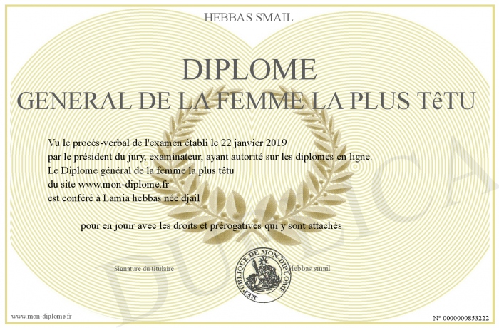 Envoyez par email votre Diplôme général de la femme la plus têtu personalisé