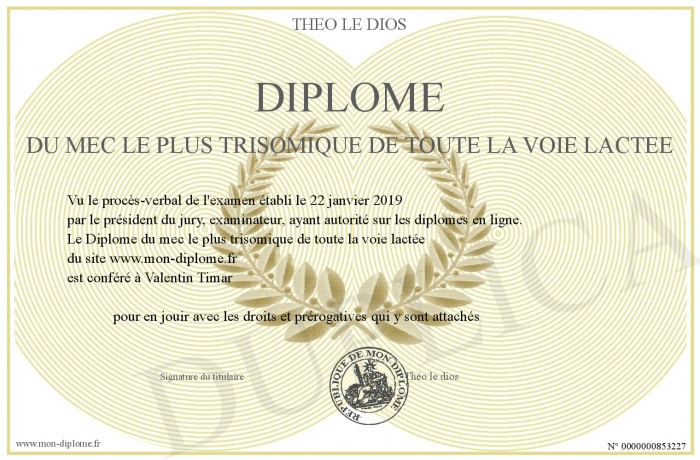 Envoyez par email votre Diplôme du mec le plus trisomique de toute la voie lactée personalisé