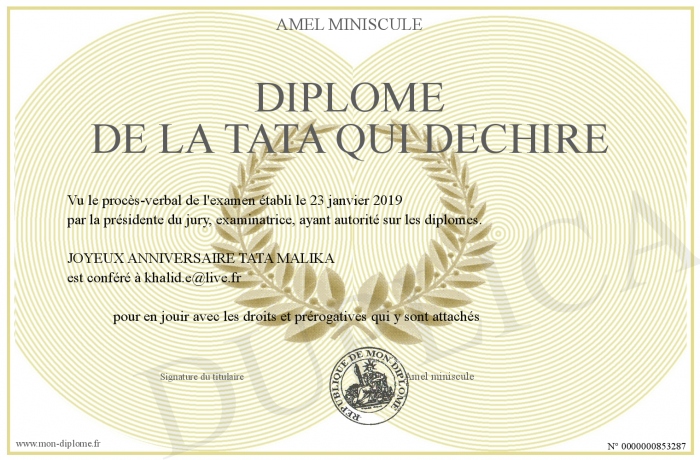 Envoyez par email votre DiPLOME DE LA TATA QUI DECHIRE personalisé