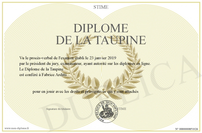 Envoyez par email votre Diplôme de la Taupine personalisé