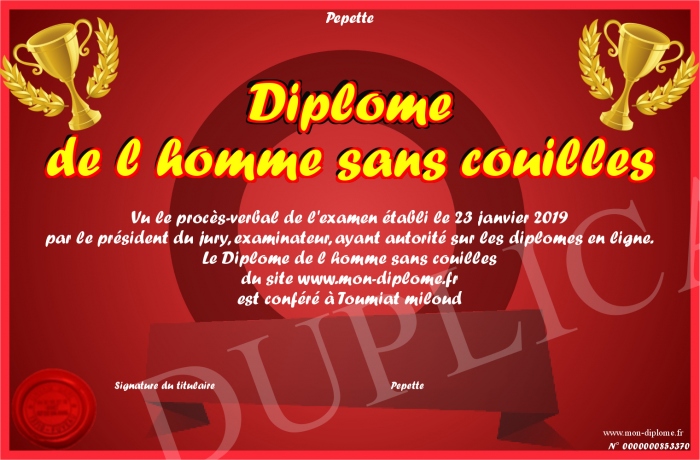 Envoyez par email votre Diplôme de l homme sans couilles personalisé