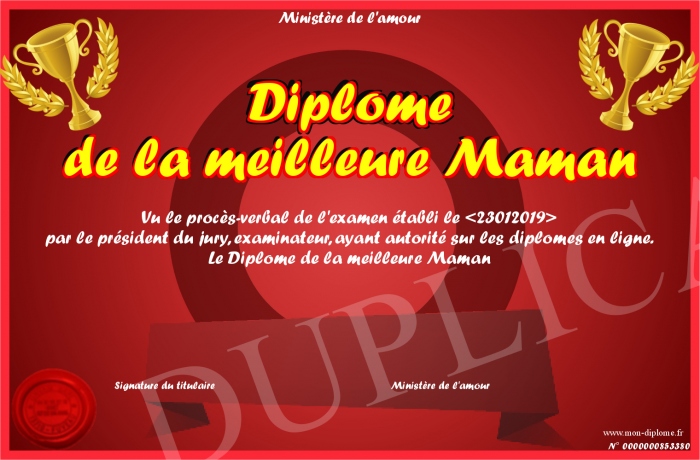 Envoyez par email votre Diplome de la meilleure Maman personalisé