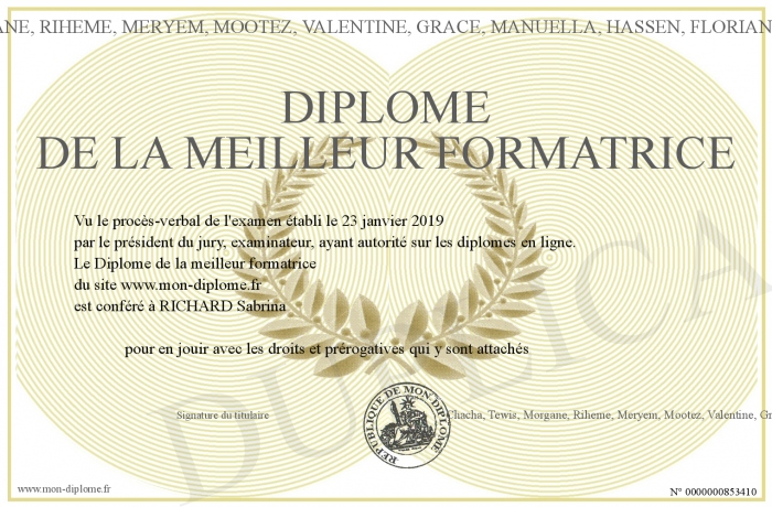 Envoyez par email votre Diplôme de la meilleur formatrice personalisé