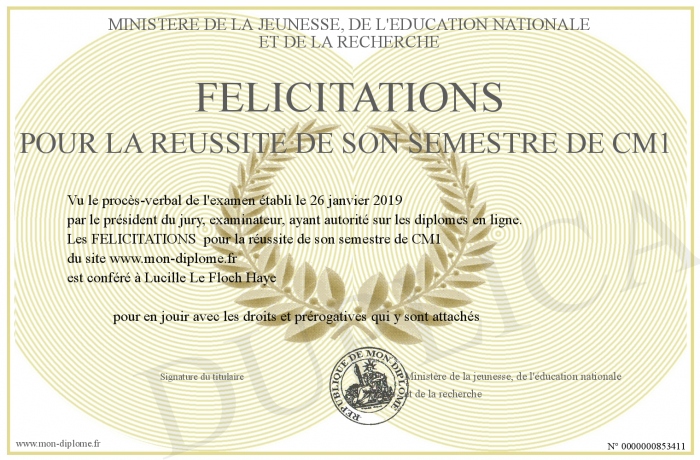 Envoyez par email votre FELICITATIONS pour la réussite de son semestre de CM1 personalisé