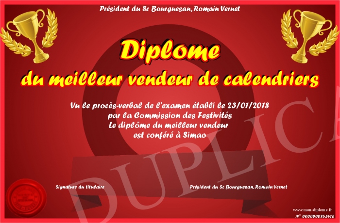 Envoyez par email votre Diplôme du meilleur vendeur de calendriers personalisé