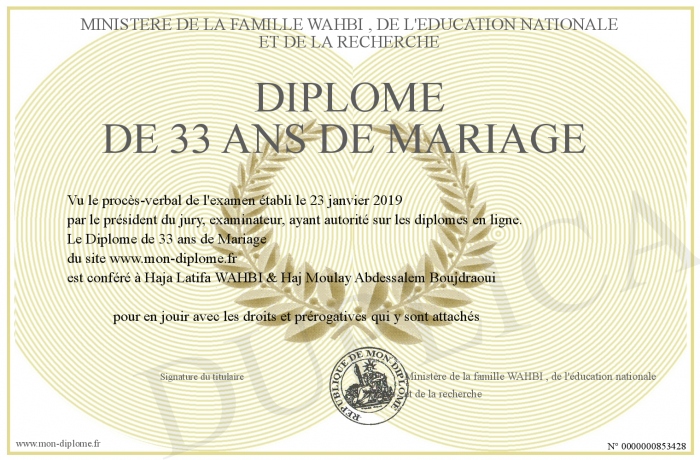 Envoyez par email votre Diplôme de 33 ans de Mariage personalisé