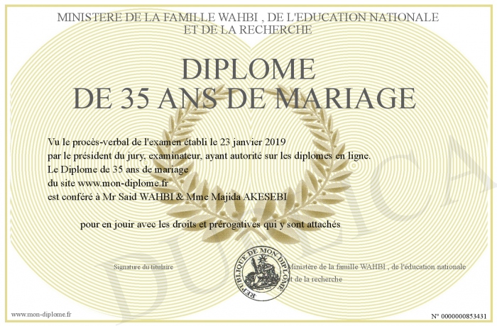Envoyez par email votre Diplôme de 35 ans de mariage personalisé