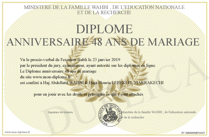 Envoyez par email votre Diplôme anniversaire 48 ans de mariage personalisé