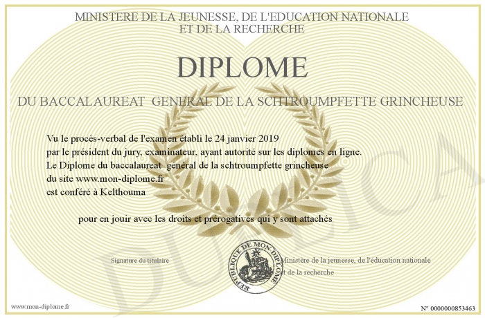 Envoyez par email votre Diplôme du baccalaureat général de la schtroumpfette grincheuse personalisé