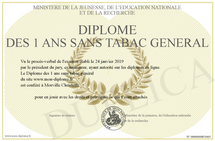 Envoyez par email votre Diplôme des 1 ans sans tabac général personalisé