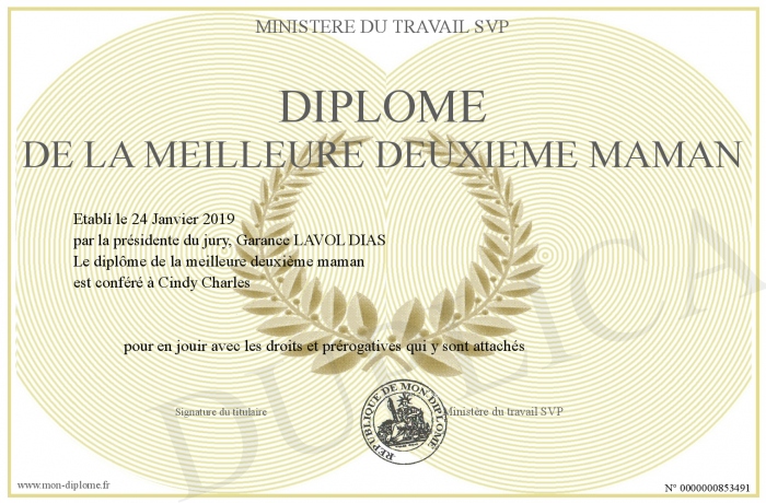 Envoyez par email votre Diplôme de la meilleure deuxième maman personalisé