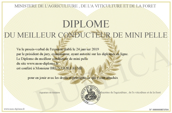 Envoyez par email votre Diplôme du meilleur conducteur de mini pelle personalisé