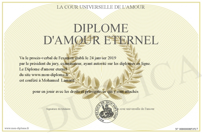 Envoyez par email votre Diplôme d'amour eternel personalisé