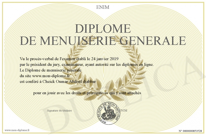 Envoyez par email votre Diplôme de menuiserie générale personalisé
