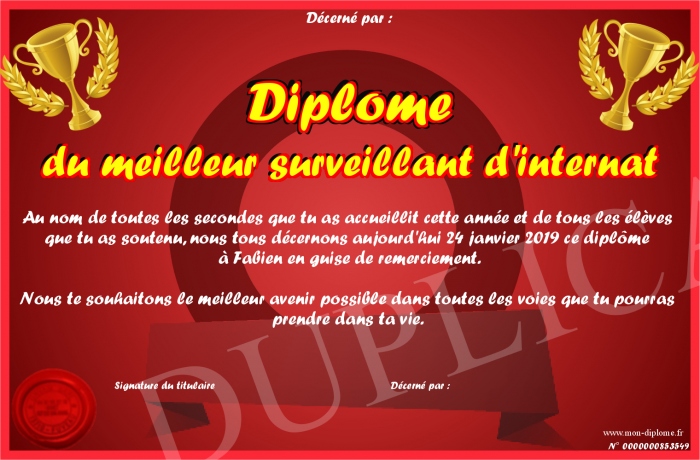 Envoyez par email votre Diplôme du meilleur surveillant d'internat personalisé