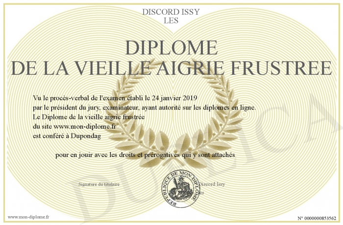 Envoyez par email votre Diplome de la vieille aigrie frustrée personalisé