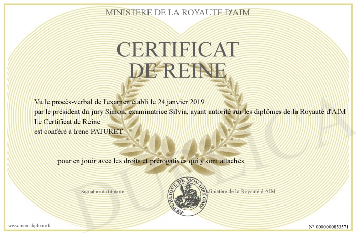 Envoyez par email votre Certificat de Reine personalisé