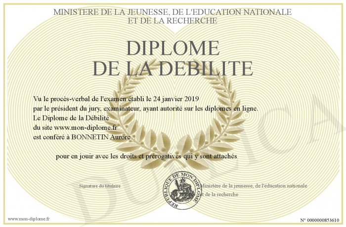 Envoyez par email votre Diplôme de la Débilité personalisé