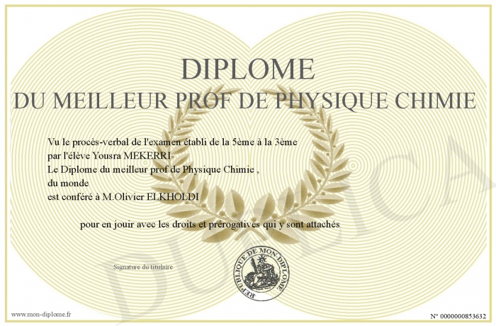 Envoyez par email votre Diplôme du meilleur prof de Physique Chimie personalisé
