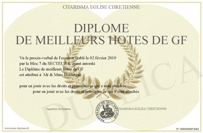 Envoyez par email votre Diplôme DE MEILLEURS HOTES DE GF personalisé