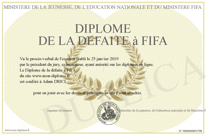 Envoyez par email votre Diplôme de la défaite à FIFA personalisé