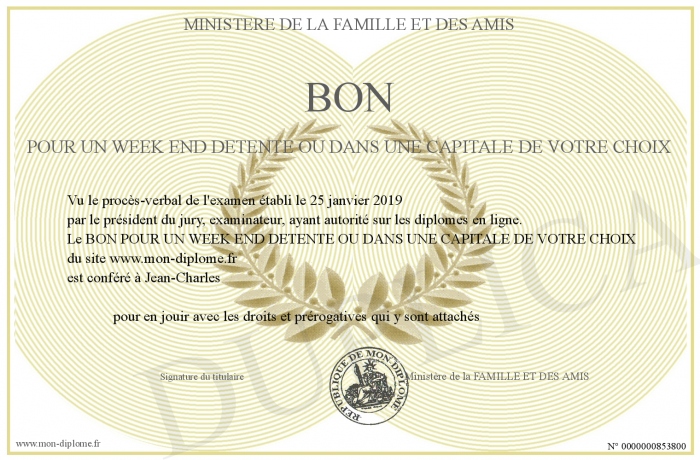 Envoyez par email votre BON POUR UN WEEK END DETENTE OU DANS UNE CAPITALE DE VOTRE CHOIX personalisé