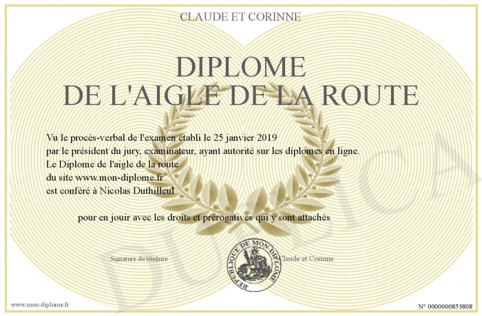 Envoyez par email votre Diplôme de l'aigle de la route personalisé