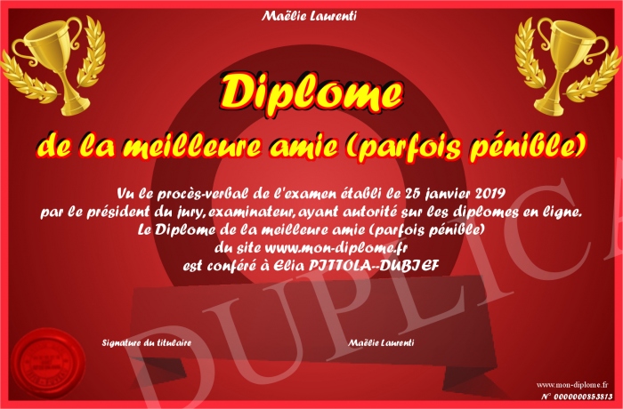 Envoyez par email votre Diplôme de la meilleure amie (parfois pénible) personalisé