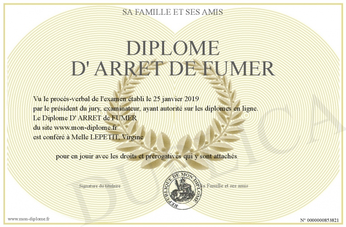 Envoyez par email votre Diplôme D' ARRET de FUMER personalisé