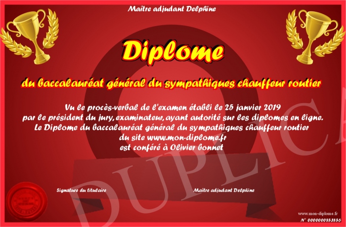 Envoyez par email votre Diplôme du baccalauréat général du sympathiques chauffeur routier personalisé