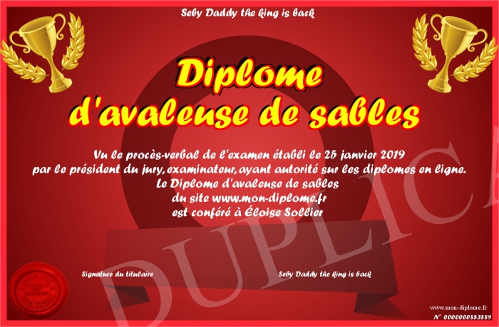 Envoyez par email votre Diplôme d'avaleuse de sables personalisé