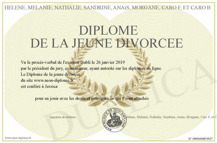 Envoyez par email votre Diplôme de la jeune divorcée personalisé