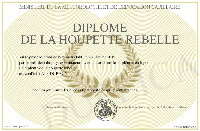 Envoyez par email votre Diplôme de la houpette rebelle personalisé