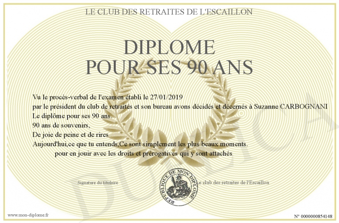 Envoyez par email votre Diplôme pour ses 90 ans personalisé