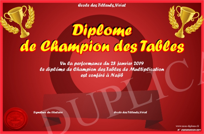 Envoyez par email votre Diplôme de Champion des Tables personalisé
