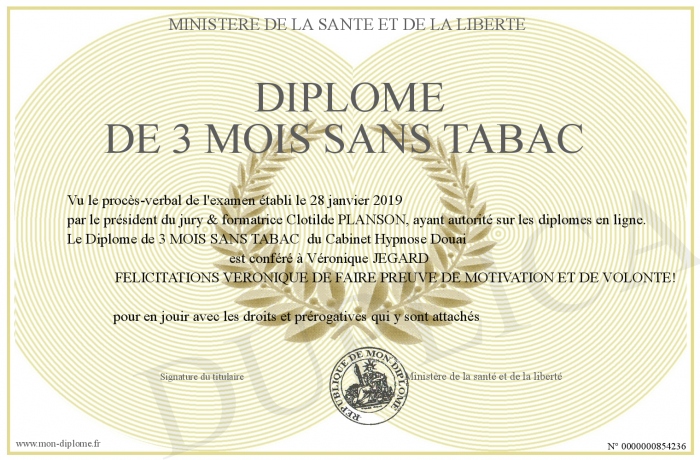 Envoyez par email votre Diplôme de 3 MOIS SANS TABAC personalisé