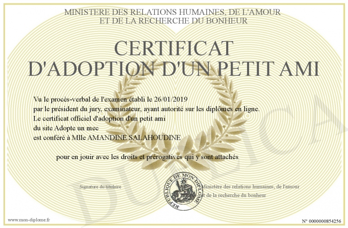 Envoyez par email votre Certificat d'adoption d'un petit ami personalisé