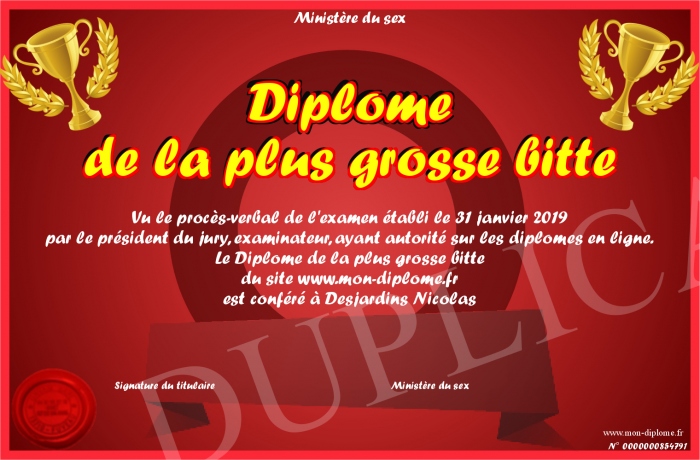 Envoyez par email votre Diplome de la plus grosse bitte personalisé