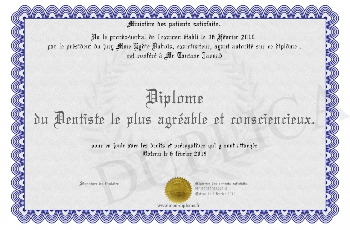 Envoyez par email votre Diplôme du Dentiste le plus agréable et consciencieux. personalisé