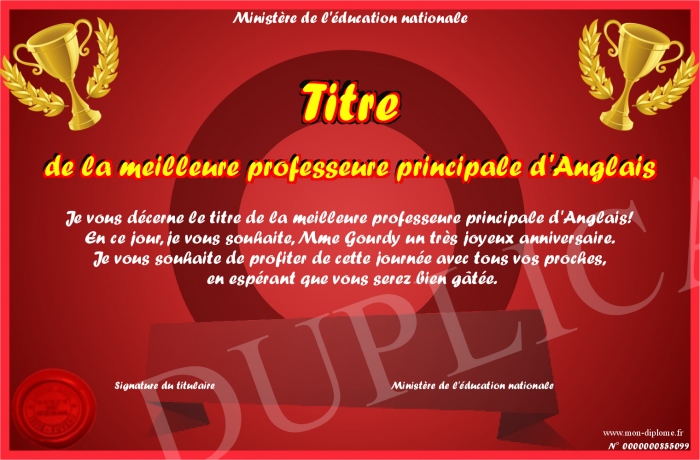 Envoyez par email votre Titre de la meilleure professeure principale d'Anglais personalisé